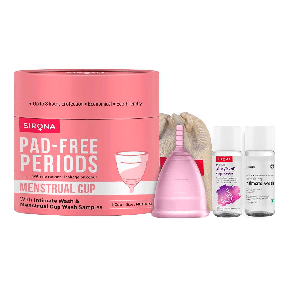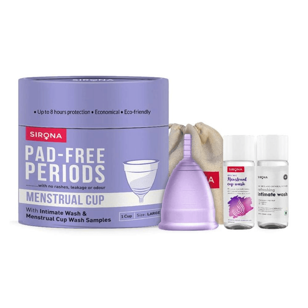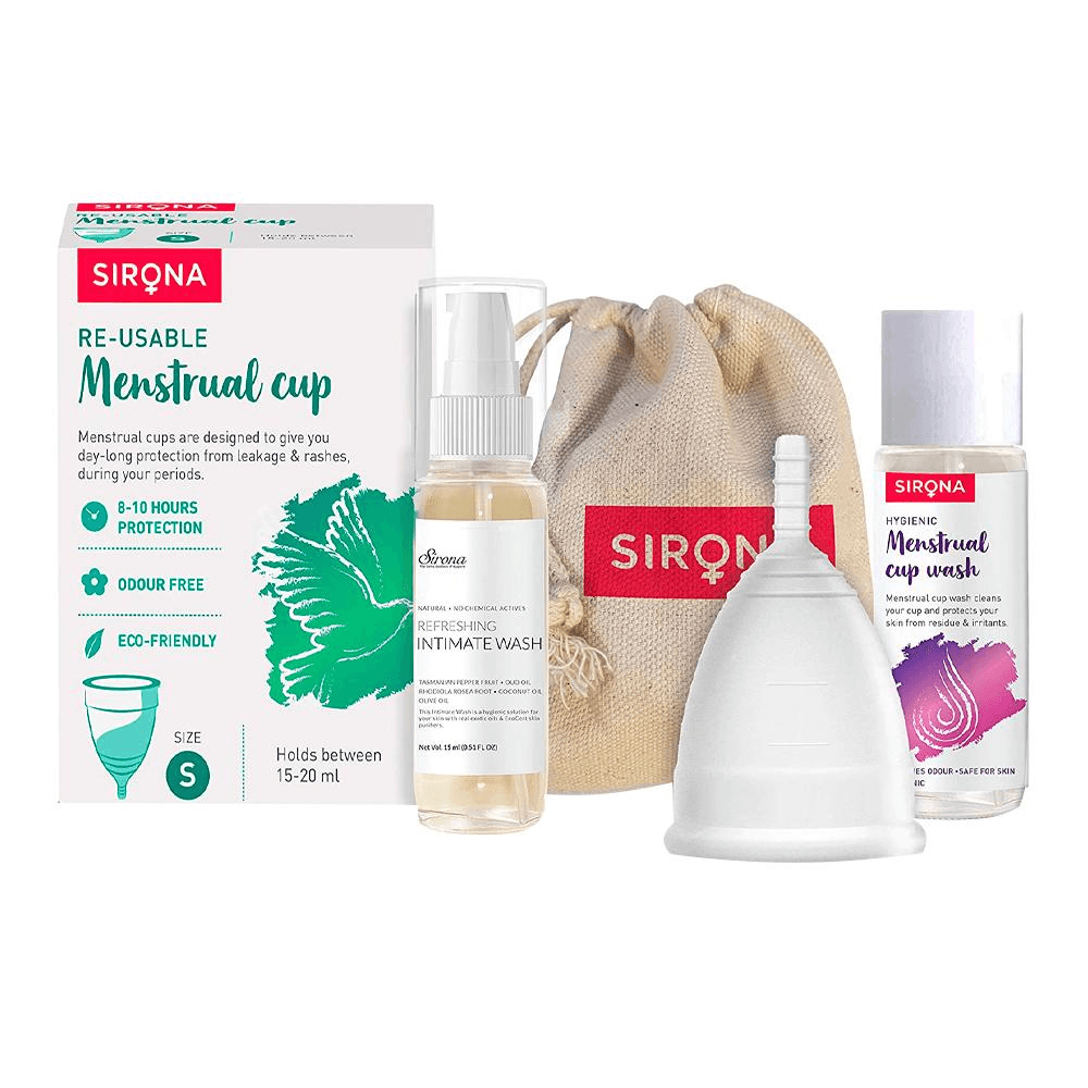 Comes With Pouch, Cup Wash & Intimate Wash: The Sirona Pro Menstrual Cup comes with a 1) Drawstring pouch in which you can store your menstrual cup without any worry. 2) A refreshing intimate wash for intimate hygiene. 3) Menstrual Cup Wash. The menstrual cup wash to clean your cup safely, without leaving behind any residue and irritants.