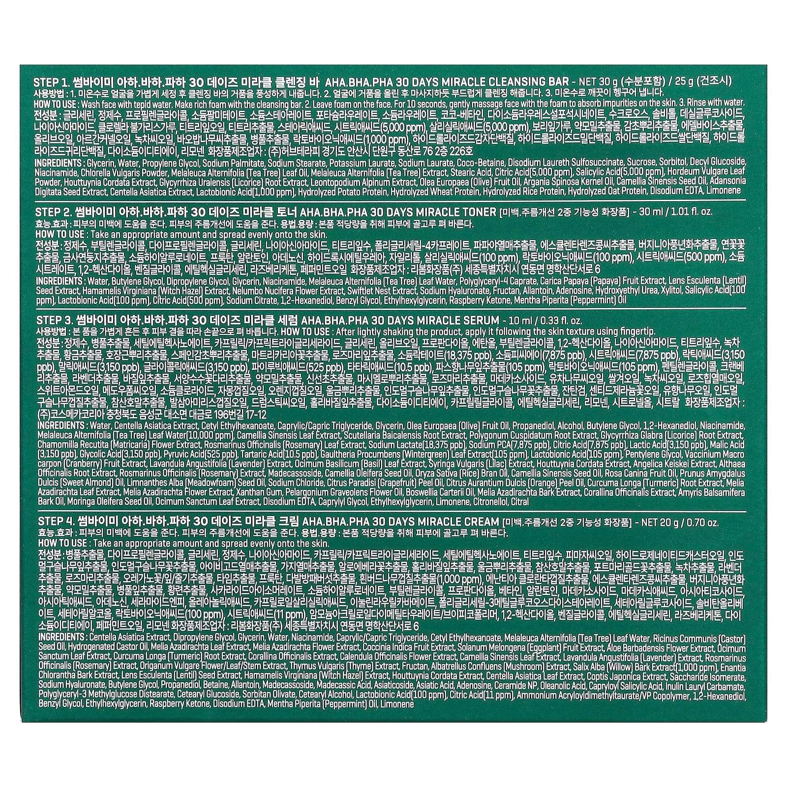 AHA. BHA. PHA 30 Days Miracle Cleansing Bar, 30 gAHA. BHA. PHA 30 Days Miracle Toner, 30 ml (1.01 fl oz)AHA, BHA, PHA 30 Days Miracle Serum, 10 ml (0.33 fl oz)AHA. BHA. PHA 30 Days Miracle Cream, 20 g (0.70 oz)